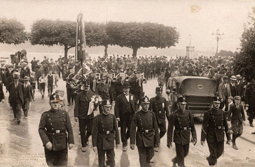1926 wurde erstmals eine Vereinsfahne angeschafft Mit der Patensektion Polizeimusik Basel wurde sie durch die Stadt Luzern geführt und anschliessend mit dem Schiff nach Altdorf gebracht, wo sie vor dem Telldenkmal in Altdorf feierlich eingeweiht wurde und mit einem Ausflug aufs Rütli verbunden 1928.